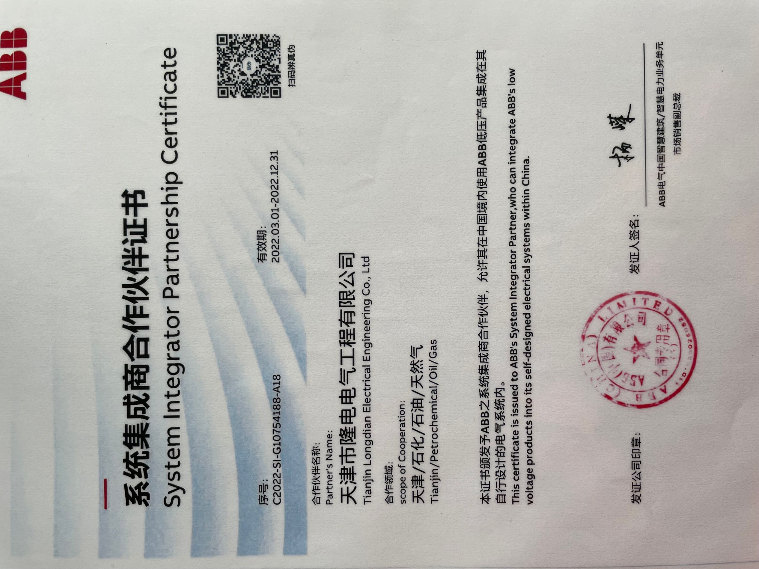 我公司系ABB之授權系統(tǒng)集成商,允許我公司在中國境內(nèi)指定區(qū)域使用規(guī)定范圍內(nèi)的ABB產(chǎn)品集成在我公司自行設計的相關行業(yè)的電氣系統(tǒng)內(nèi)。