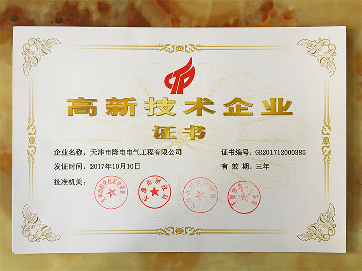 在連續(xù)數(shù)年被評(píng)定為國(guó)家級(jí)高新技術(shù)企業(yè)之后,近日,我司再次獲得由天津市科學(xué)技術(shù)委員會(huì)、市財(cái)政局、市國(guó)稅局、市地稅局等部門聯(lián)合頒發(fā)的國(guó)家“高新技術(shù)企業(yè)”證書。“高新技術(shù)企業(yè)”證書的申報(bào)成功,將極大推動(dòng)我公司自主創(chuàng)新、自主研發(fā)的進(jìn)程,這標(biāo)志著我公司在高新技術(shù)企業(yè)中繼續(xù)得到國(guó)家的肯定,充分體現(xiàn)了我公司在行業(yè)高新技術(shù)及產(chǎn)業(yè)水平的領(lǐng)先地位,同時(shí)也是公司發(fā)展史上又一座輝煌的里程碑。祝愿天津市隆電電氣工程有限公司在以后的發(fā)展道路上銳意進(jìn)取、節(jié)節(jié)攀升,創(chuàng)造更加燦爛、美好的明天。