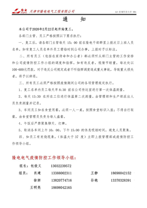 隆電電氣于2020年2月22日起開始復(fù)工,具體通知如下: