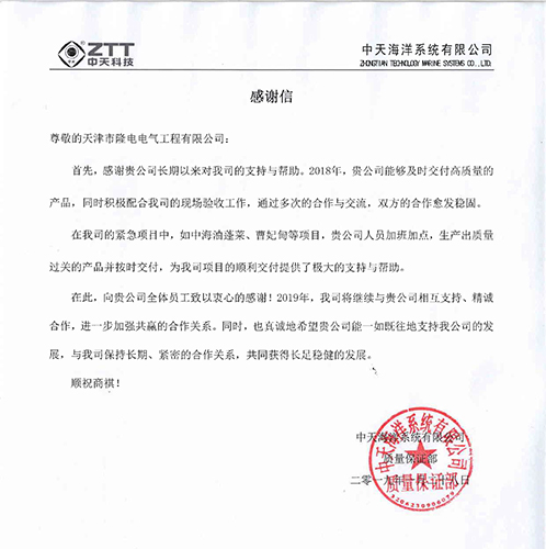 今天,公司收到中天海洋系統(tǒng)有限公司發(fā)來的感謝信。信中對我司在諸多緊急項目中,加班加點保障工程進度,質(zhì)量可靠并按時交付,對于確保海油蓬萊、曹妃甸等重大建設(shè)項目的順利實施和推進給予充分肯定,并對我公司長期以來對海洋石油建設(shè)相關(guān)工程作出的努力和貢獻表示衷心感謝!