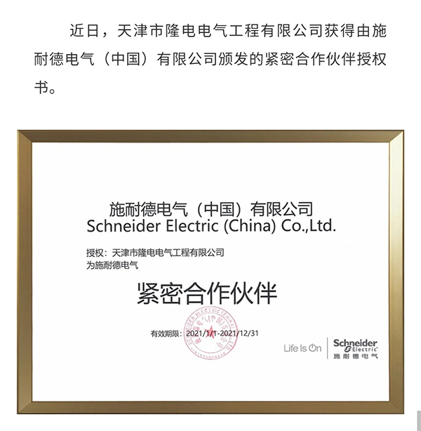 隆電電氣成為施耐德電氣(中國(guó))有限公司緊密合作伙伴