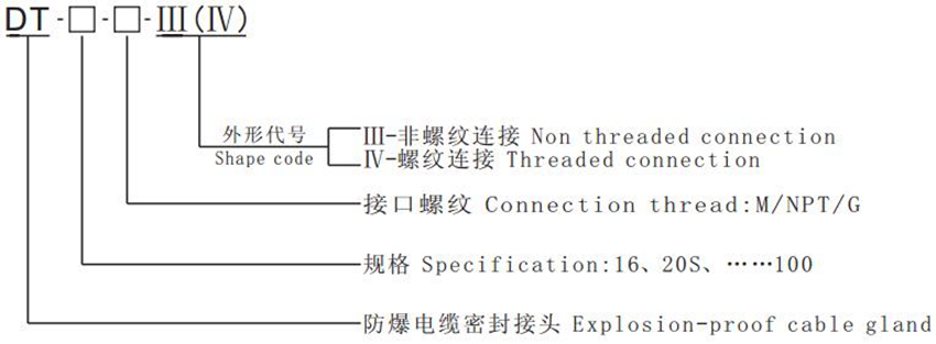 Example: DT-20-M-Ⅲ, 20# explosion-proof cable gland,connection thread M20×1.5.